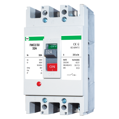 Автоматичні вимикачі FMC2/3U - комутаційні апарати, призначені для захисту електричних мереж від тривалих перевантажень і струмів короткого замикання (надструмів). Можуть використовуватись для оперативного включення і відключення ділянок електричних мереж змінного струму частотою 50Гц напругою до 690В. Конструкція автоматичних вимикачів FMC2/3U передбачає застосування додаткових пристроїв, що монтуються в середину вимикача і значно розширюють функціональні можливості в сфері контролю роботи або керування автоматичним вимикачем.