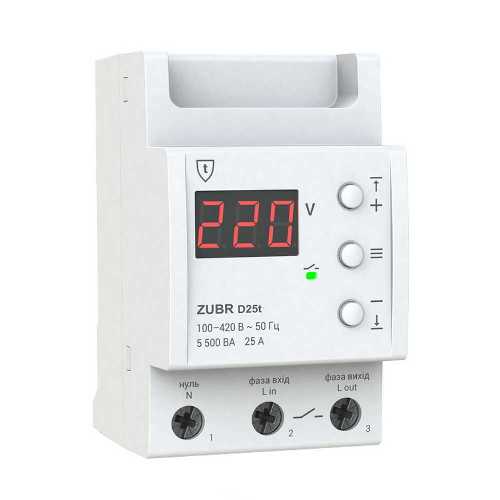 Однофазні реле напруги ZUBR D (t) призначені для захисту обладнання від надмірних коливань напруги. При настанні аварійної ситуації пристрій вимикає подачу навантаження. Реле контролю напруги застосовуються в однофазних мережах змінного струму (230 В). Додатково має термозахист. ZUBR Dt з високою точністю вимірює напругу і вимикає навантаження до того, як стрибок напруги негативно вплине на підключені електроприлади.